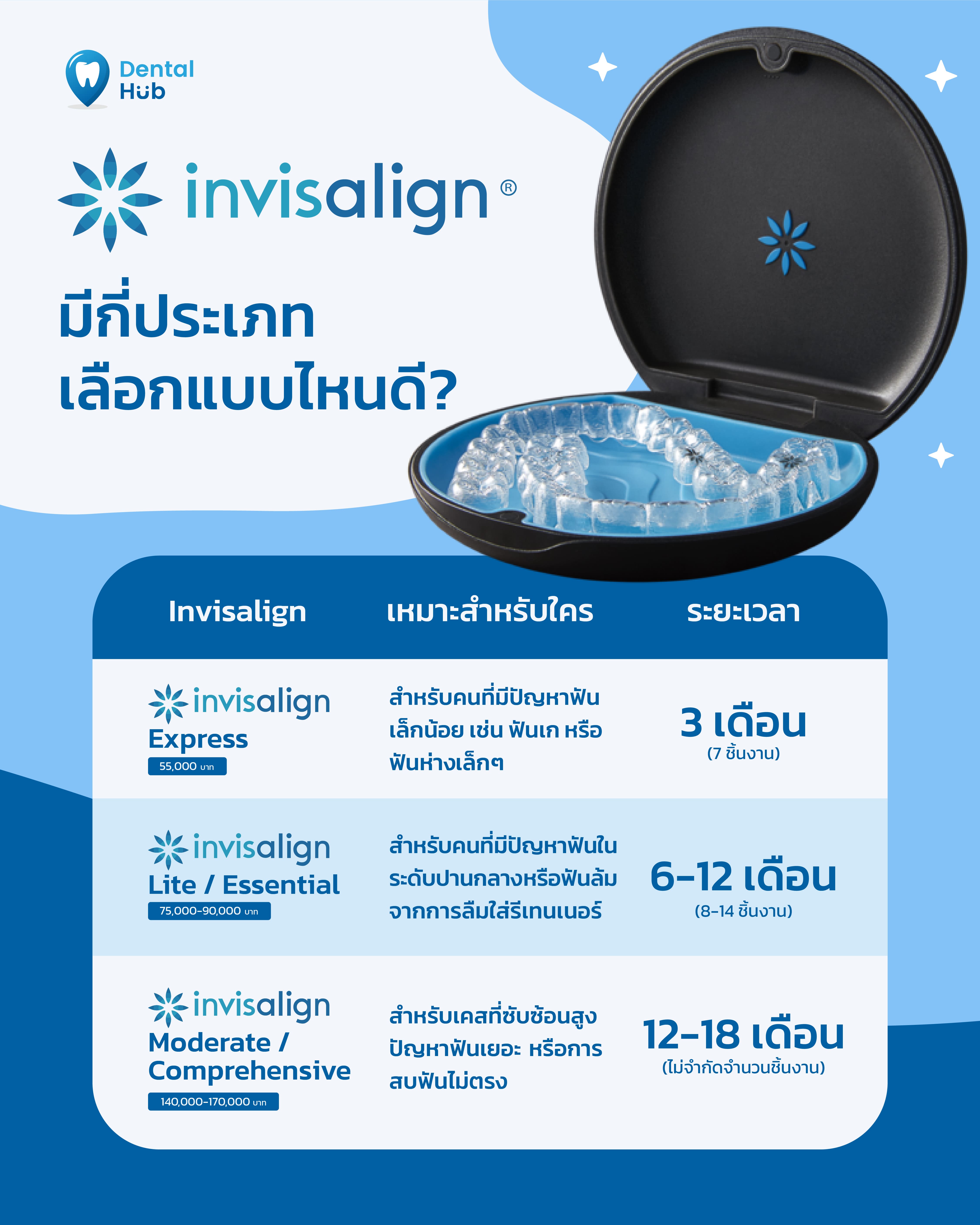 จัดฟันใสที่คลินิกเดนทัลฮับเลือกใช้คือ ระบบ invisalign ที่สร้างรอยยิ้มแก่คนไข้มากเป็นอันดับหนึ่งของโลก ออกแบบมาเพื่อตอบโจทย์ความต้องการที่หลากหลายของผู้ที่มีปัญหาฟัน ซึ่งไม่ใช่ทุกคนที่จะมีปัญหาฟันแบบเดียวกัน บางคนฟันเกเล็กน้อย บางคนฟันซ้อนหรือการสบฟันผิดปกติ ด้วยเหตุนี้ Invisalign จึงถูกพัฒนาให้มีหลายแบบเพื่อให้เหมาะสมกับแต่ละปัญหาและสถานการณ์ของผู้ใช้