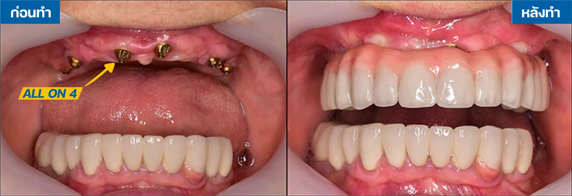 ใส่ฟันทั้งปากแบบติดแน่นชนิดเซรามิกพยุงด้วยรากเทียม 4 ตัว ไม่ต้องถอดเข้าออก ไม่มีเพดานให้รำคาญ บางเคสสามารถเสร็จมีฟันพร้อมยิ้ม ภายใน 3 วัน
